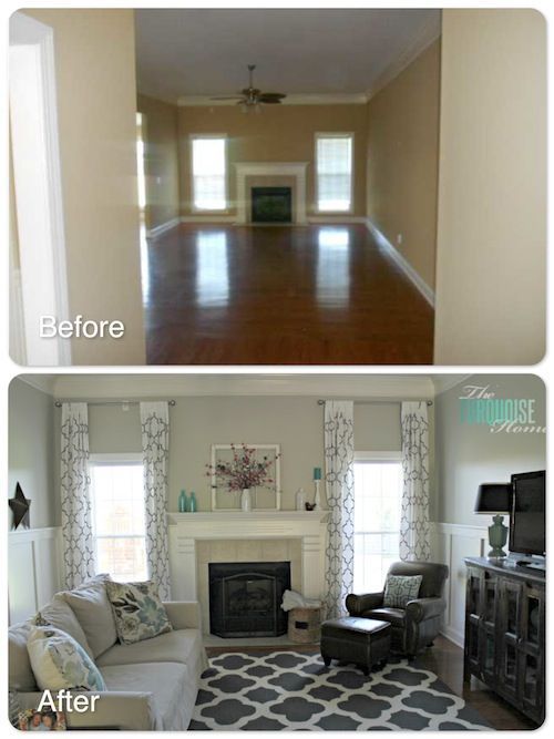Gorgeous Living Room Makeover with beautiful DIY board and batten, Pottery Barn sofa, stenciled curtains, warm wood and pops of turquoise! June 30, 2019 / Jennifer Larson