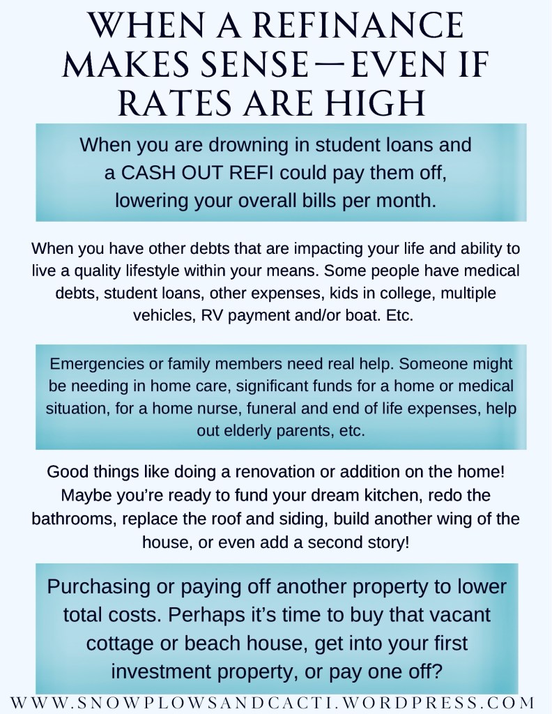 For most, this is pretty self-explanatory from the image, but if you’re not in any of these situations, remember that you can also refinance at any time for a very positive reason. You might prefer to have a second mortgage on your home to fund tuition rather than you or a child paying ridiculous student loans for life. You might be doing well in life and don’t want to move, but also would like a new boat in the driveway, or to travel abroad for a year or two. Equity can be your own personal bank that you use and repay when needed. Once you pay it off, it’s there again and usually higher than before because most of the time, equity increases through the years. That’s why so many people use their home equity to purchase a rental property all cash and pay the cash out refinance so they can win better deals and beat other offers that require a financing contingency at contract. Others use a HELOC to buy what they need and keep paying it every month until it closes or they purchase what they pulled out money for.