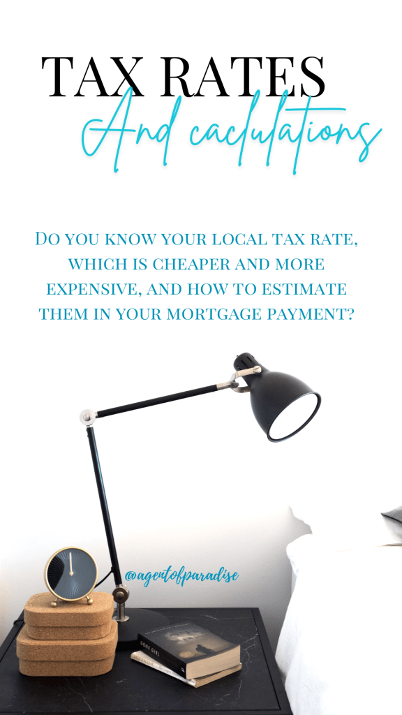 Remember that taxes go up maximum 2% every year, on average about 1%, based on the property’s last assessment (usually last price it sold at) until it is sold again and the new tax rate becomes based off the new sales price. Calculate your local tax rate off the purchase price of a home you are intending to buy. To look up local tax rates in your local area, visit the County Assessor’s site. For Riverside County here in SoCal: