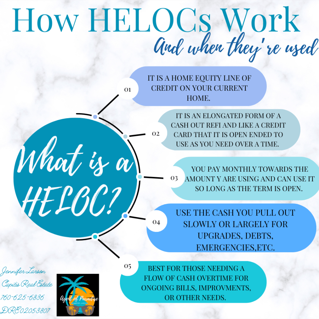 Lastly for today, we have the HELOC. A Home Equity Line of Credit, not to be confused with a Home Equity Loan, is an open line of credit on your home like a credit card that is valid for a decade as you need in increments and then closes to begin the repayment process.