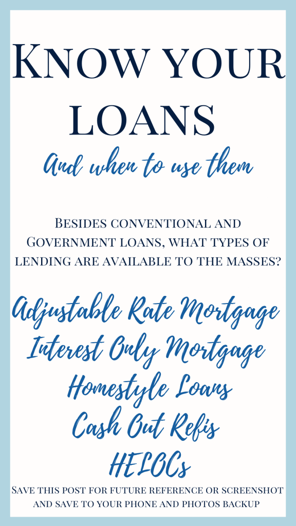 That sums up today’s post on loans and Refi products. More coming tomorrow for renovations, new builds, more information on ARMs loans, and more! Stay tuned.