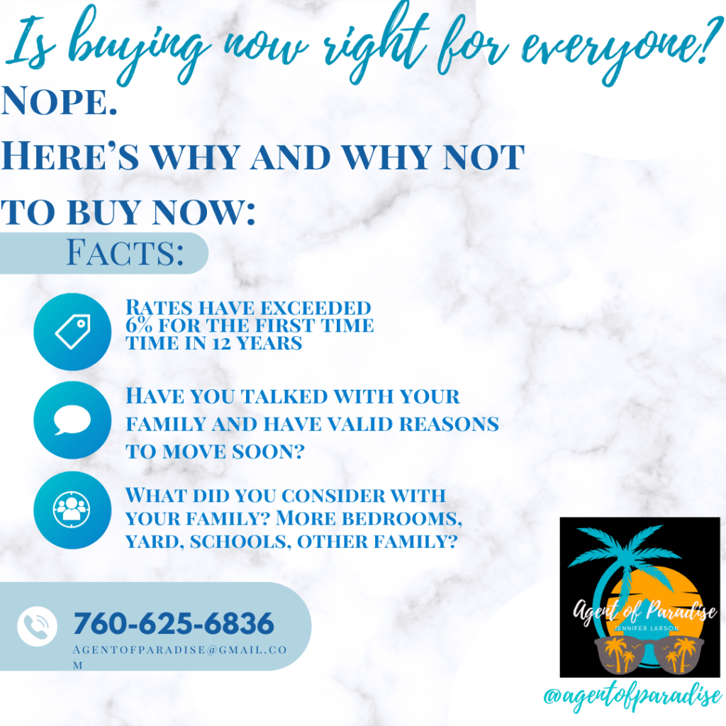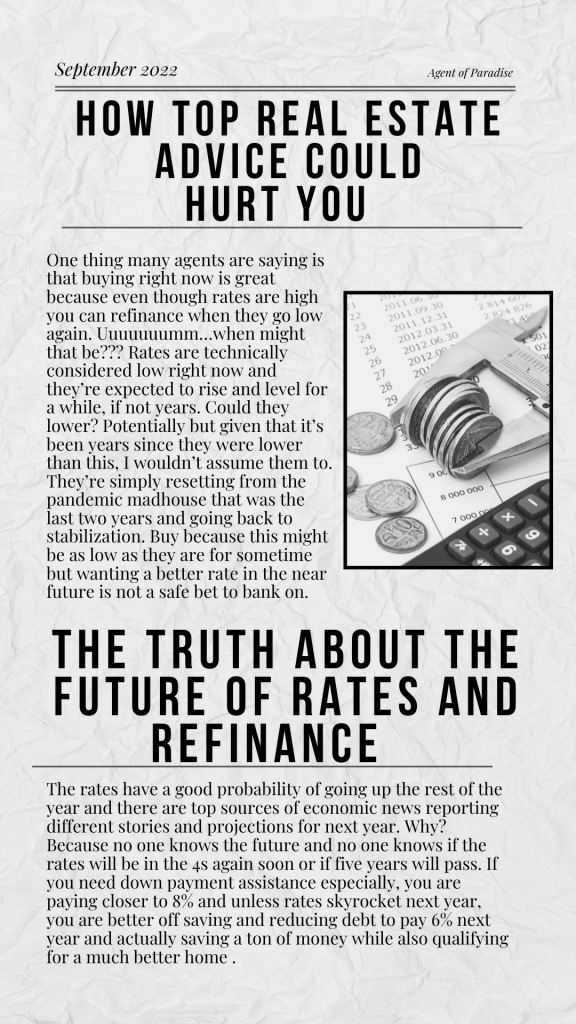 Could they all be right and rates will dip below 5% again? Possibly but the question is really when? Living in the hope it will be in the next couple years can be a foolish and devastating move if that’s your motivation for purchasing a home now. Maybe it doesn’t really matter if you are already dead set on buying; BUT, what if you are not because you’re on the fence about your finances, if this is really where you want to grow your career and family, or you’d rather wait until your credit and down payment savings are higher to offset the 6.5% you’re being offered (or 8% if it’s a no down payment assistance program)then it could in fact be best to wait until the follow year where it might actually be cheaper to purchase at a lower interest rate and market cost for you. In that case, the argument of a potential drop in rates may not be best because there’s an equal chance they won’t. If they do and you waited, you lose nothing because then you can buy at those lowered rates with the savings and credit you worked on for a few more months. However, if you let it persuade you before you were totally ready and the rates in fact DO NOT lower, you put yourself in a situation you were never comfortable entirely to begin with and if anything else in life happens, more inflation and gas prices, health issues, job cutbacks or whatever, you might be in a position where buying too soon is now causing financial burdens. That’s where this advice can hinder you. If you’re worried rates will rise and would rather buy and you are comfortable buying now then it makes sense. If the rates lower, great, refinance, and save money; BUT if you’re not ready 100% now and not even getting the rates in the 5s right now because of credit, DTI, down payment, etc sometimes waiting saves; especially if the inventory isn’t as good also. Some sellers are holding back and sometimes a year can change people’s tune waiting to see if a recession hit, prices go too low, they do need to move after all, etc.