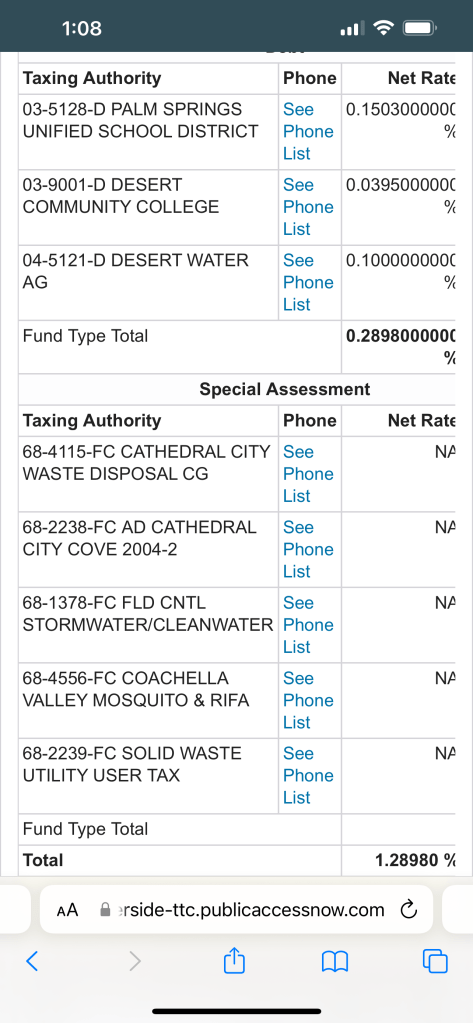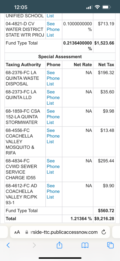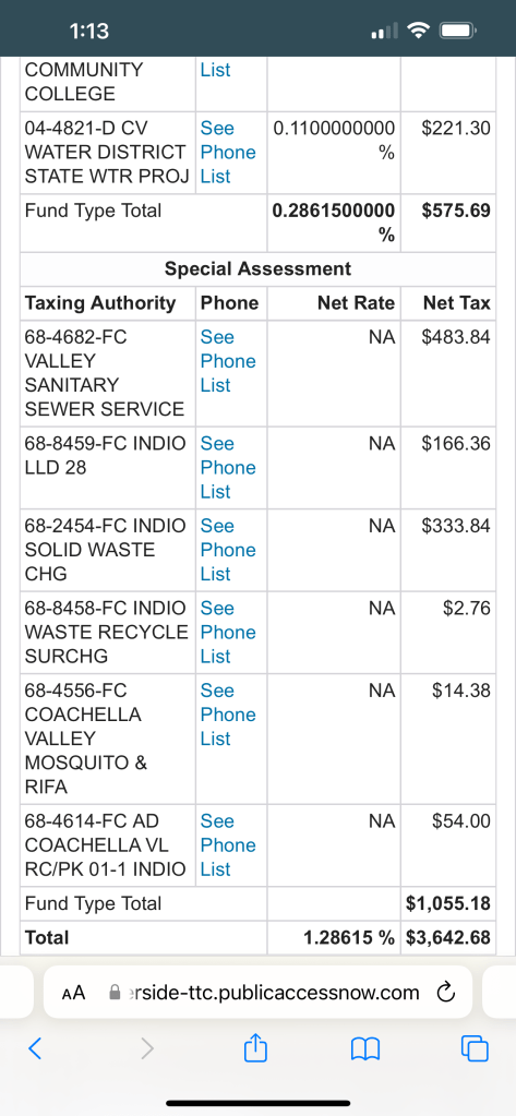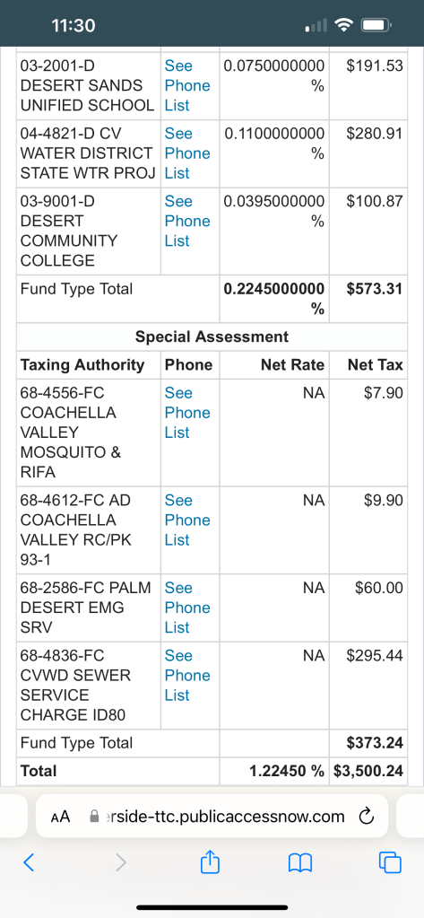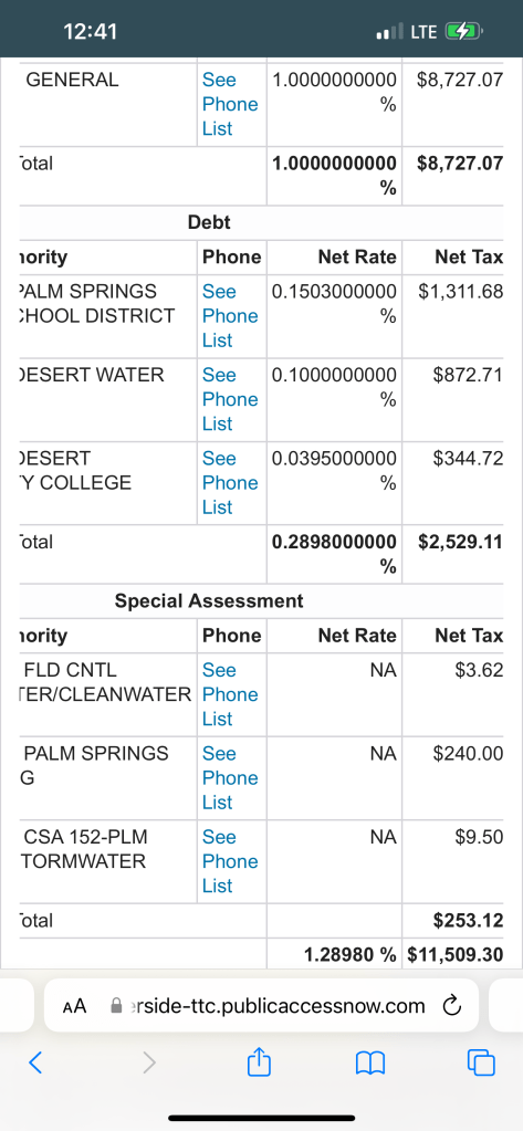 Below I will share screenshots of actual homes from the area to show exact tax rates and their breakdowns of how they are allocated to city services. You will notice the city of Indian Wells not only has the smallest tax rate but also the shortest list of allocation because it doesn’t allocate to any vector control, sewer services, parks and recreation divisions, or even emergency services as individual recipients. The city uses its general fund primarily.