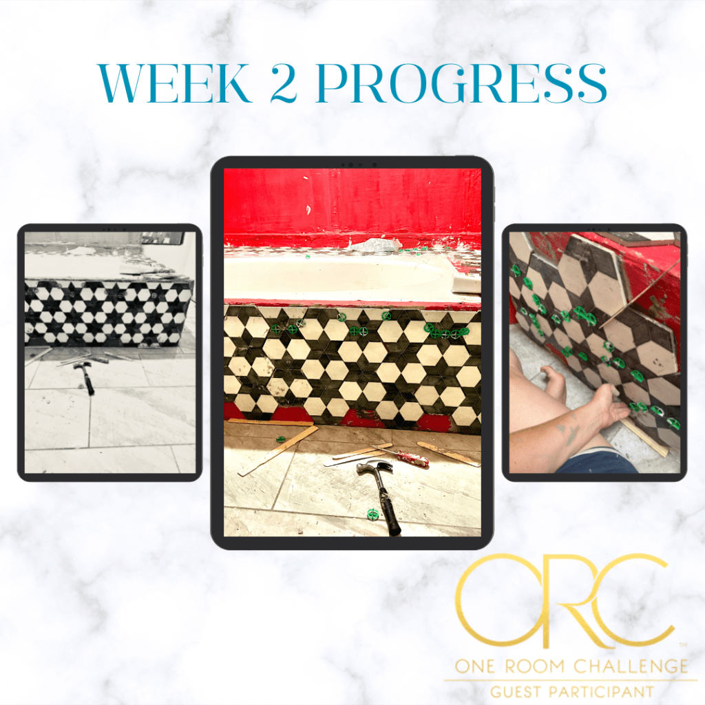 The last two weeks I have participated in the Fall One Room Challenge to makeover one room for two months. We’re working on our master bathroom and so far we have tiled and installed a new vanity, tiled almost completely the soaker tub surround, and for week 3 will be tiling the shower. The goal is to be completely done with tile by the end of the first month. Here’s where we’re at so far: