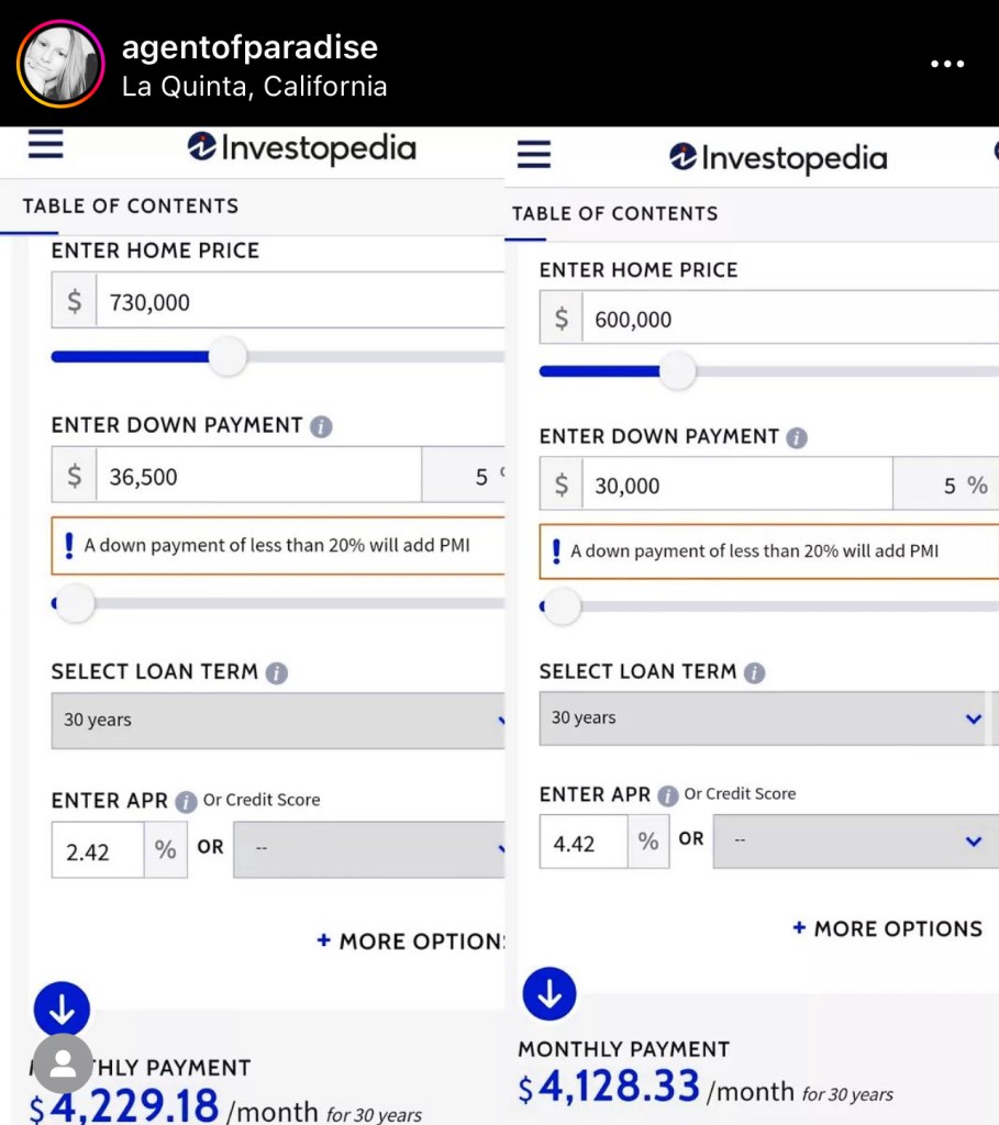 And this is based on a person with excellent credit. If you have less than 700, you’re paying EVEN MORE per month on the 600k, because you won’t qualify for more, if you even get approved for the 600k with that low of credit, because your interest will be even HIGHER.