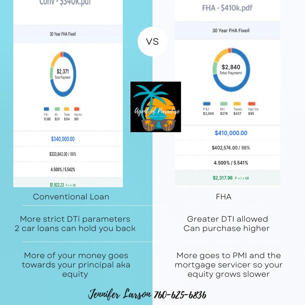For instance, if you have two car payments that will greatly hinder your buying power with a conventional loan while FHA is more forgiving; allowing up to 45% DTI. With conventional you need to cap it at 30% and watch your credit card balances so they don’t rise over that.