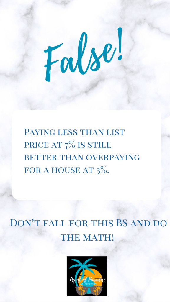 NEXT, most people didn’t pay anywhere near $100k over but even if they did it’s because the house was best for their needs and they will be in it for YEARS to come. Aka when they sell the market will be even more valuable then and they’ll still have plenty of equity. The average though “overpaid” $40k but STILL and WILL keep that equity and have even more a few years from now if they sell. Again, NOT overpaying. At all. So stupid what these “top” (self proclaimed) agents are saying. Third, do the MATH. 7% interest over 3% is more than DOUBLE which means a huge payment for a smaller, lesser house ON THE SAME BUDGET AND PAYMENT. Let. THAT. Sink. In. FACTS. Not BS. FACTS.