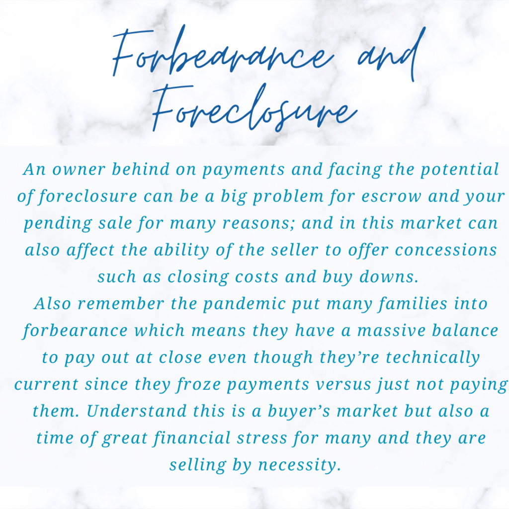 Be aware that again, someone has to pay that forbearance and it’s the seller’s responsibility so if they have agent fees, selling costs, and a forbearance balance, they may not be able to negotiate much, paying closing costs, offer incentives, and may even request help because of all these mounting costs and little equity; despite this buyer’s market; which could be thousands from you. Again, someone has to pay at sale to transfer ownership.